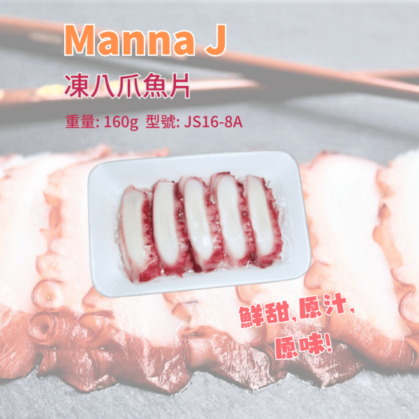 凍-Manna J 大八爪魚片(8gx20片) /包(JS16-8A/100672)是一款急凍海產,適合解凍后切片即食或用作壽司材料。這款大八爪魚片由上等新鮮大八爪魚烚熟并及時速凍,以保持鮮味,如果您喜歡壽司或刺身,這款急凍大八爪魚片絕對值得一試,儲存方法建議在-18℃雪櫃中保存,開袋后則建議在1-2天內盡快食用。